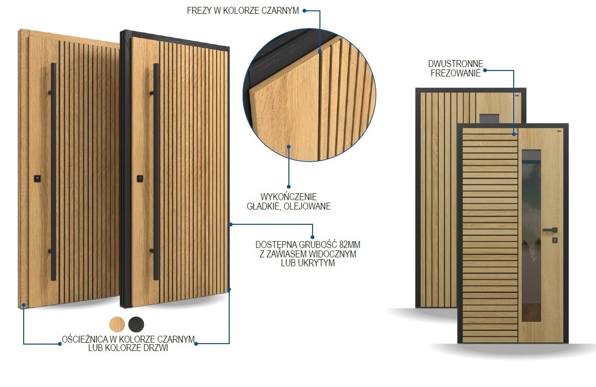 Ościeżnica w kolorze czarnym lub w kolorze drzwi. Frezy w kolorze czarnym. Wykończenie gładkie, olejowane. Dostępna grubość 82 mm z zawisem widocznym lub ukrytym.